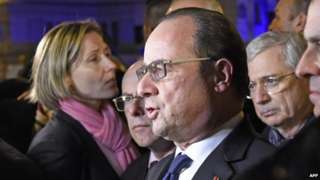 French President Francois Hollande (centre) has visited the Saint-Antoine hospital in Paris, where a number of the injured in the attacks are being treated.