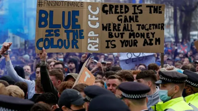 Sama da magoya bayan Chelsea 1,000 suka taru a Stamford Bridge kafin wasan da za ta kara da Brighton a Premier, inda suka nuna bacin rai da kungiyar ta fada wannan shirin.