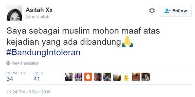 "Teriak ke Myanmar supaya hargai minoritas, di kampung sendiri gak bisa menghargai minoritas. Malu atuh euy #BandungIntoleran," kata Feryanto Setyadi dengan akun @Ferysplace di Twitter.