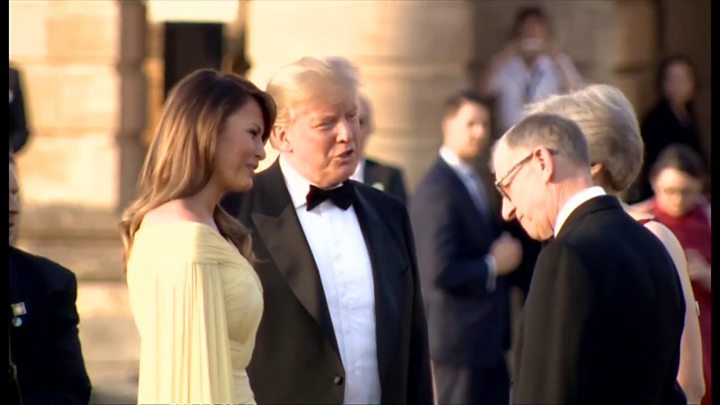 サンが掲載したトランプ氏のインタビューが話題となるなか、大統領夫妻はメイ首相主催の正装での晩餐(ばんさん)会に出席した。