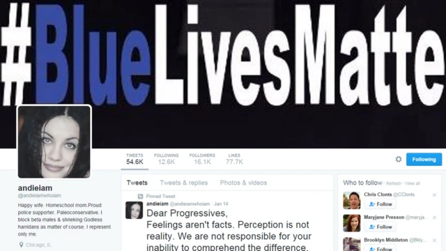 So what do we know for sure about her - and how did she become such a divisive figure? Pauly tweets as @andieiamwhoiam. She lives in Joliet, a city of 150,000 people in Illinois about an hour's drive from Chicago, and is married to a Joliet police officer, Michael Pauly.