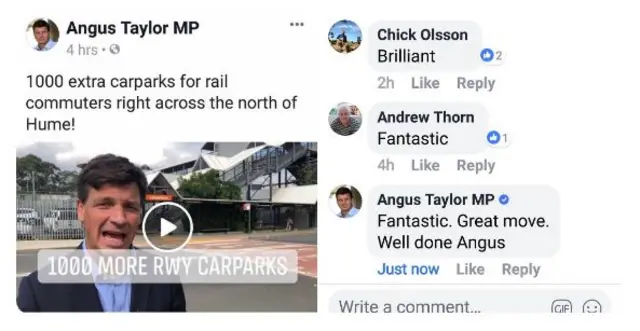 Angus Taylor, a Liberal MP for Campbelltown and energy minister, posted a Facebook video on Monday announcing 1,000 extra parking spaces at railway stations in New South Wales.