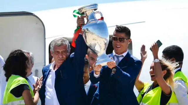 Два пожарные машины полили приземлившийся самолет красно-зелеными струями воды (это цвета национального флага Португалии). Первыми на трапе появились тренер сборной Фернанду Сантуш и капитан команды Криштиану Роналду с трофеем в руках.