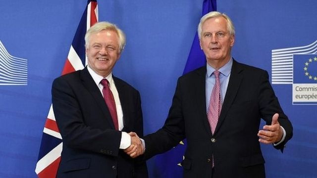 Британский министр по выходу из Евросоюза Дэвид Дэвис и главный переговорщик ЕС Мишель Барнье начали в Брюсселе переговоры о "брексите".